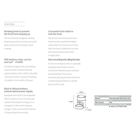 With Back-up rechargeable lithium battery. Built-in Personalized voice recording system allows your pet to hear your voice during mealtime. Feed your pets by setting up feeding schedules or manually in the App.